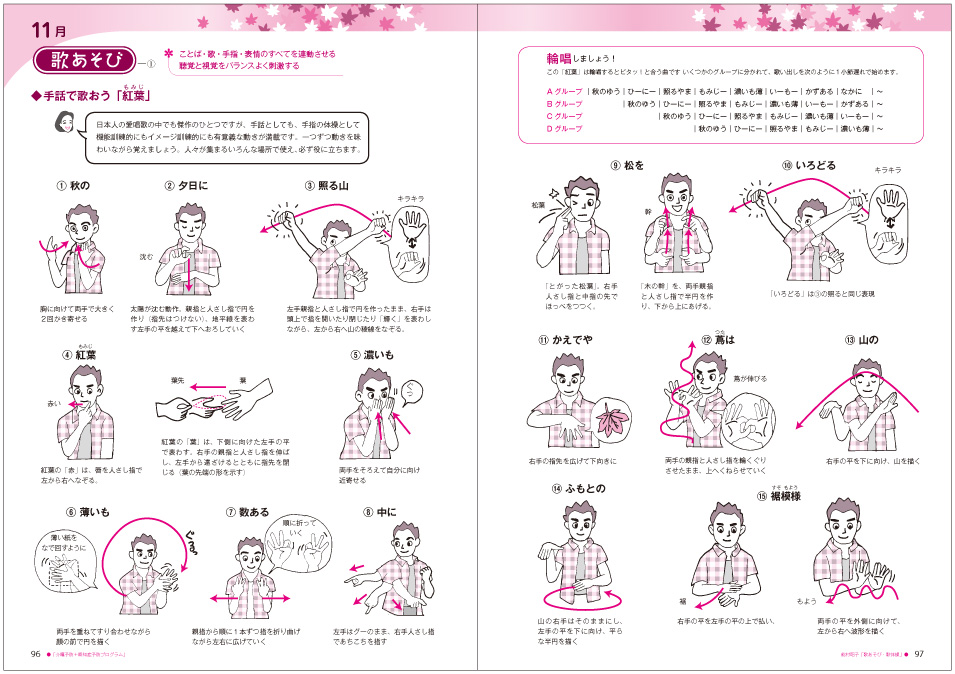 手指を動かし脳トレになる歌う手話(イラスト付)や、ゲーム感覚で楽しめるネタがいっぱい。