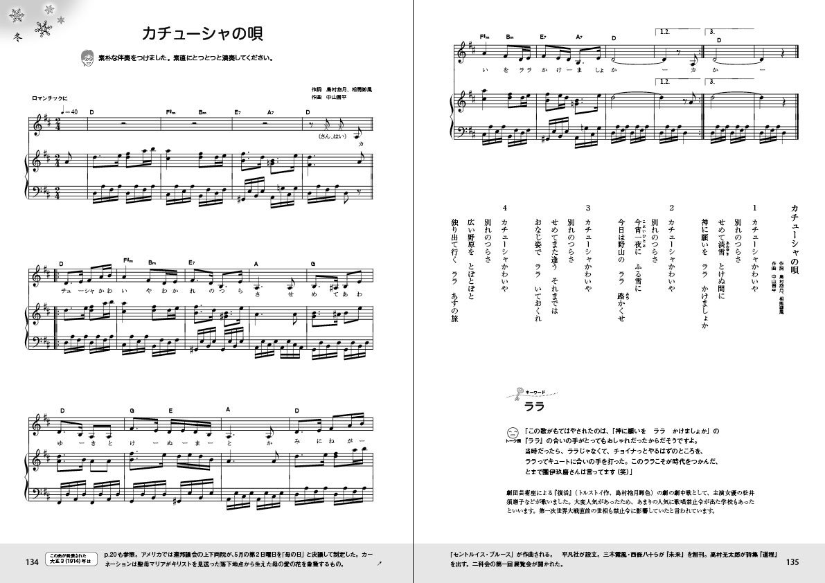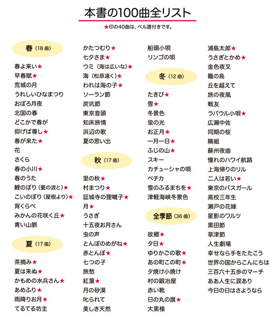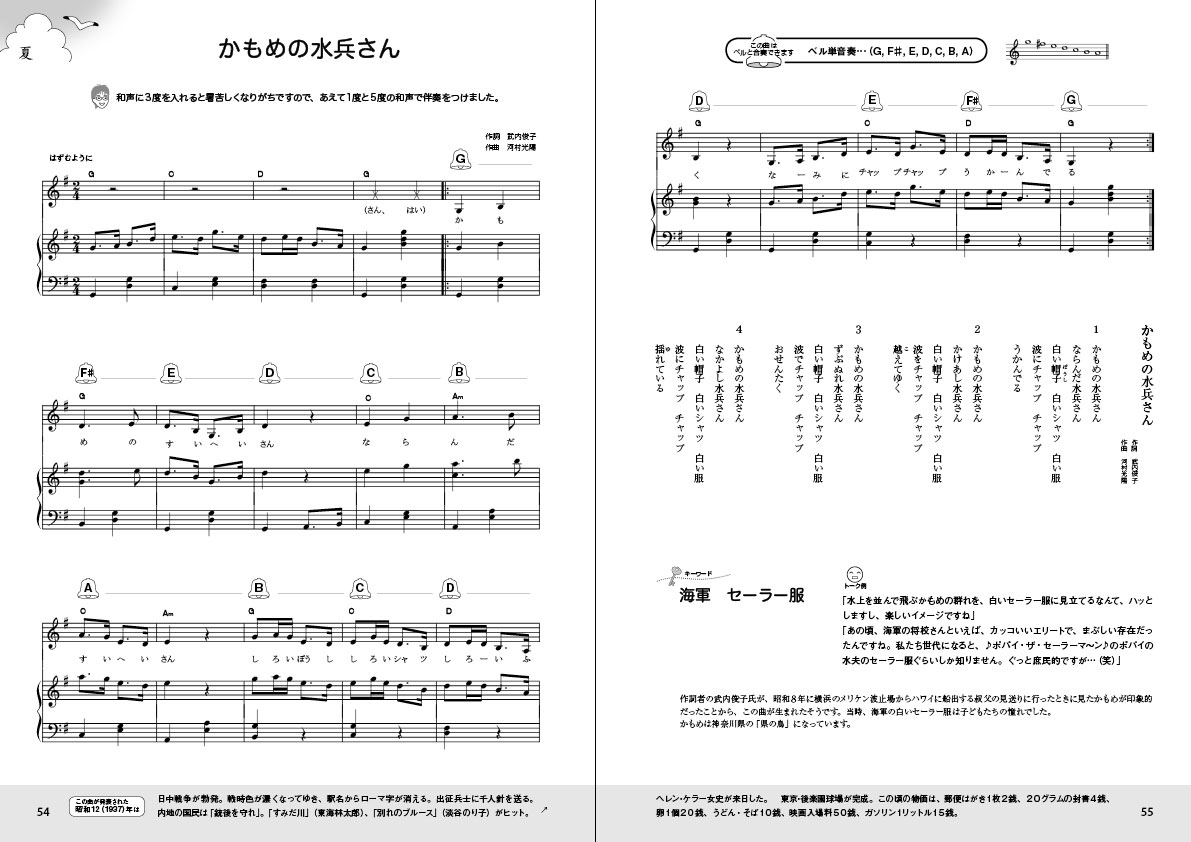 施設で最もよく歌われる100曲を選び、高齢者が歌えるキーに移調した全曲伴奏譜。施設にある61鍵キーボードに対応し、音の響きを配慮した伴奏アレンジです。高齢者の「あの時代」にすぐ話を合わせられるよう、曲ごとに「回想キーワード」と「この曲が発表されたこの年は」の世相ひとくちメモで、明治・大正・昭和の話題通に。100曲のうち40曲にベル譜が付き、美しいベル合奏を易しい奏法で楽しめます。