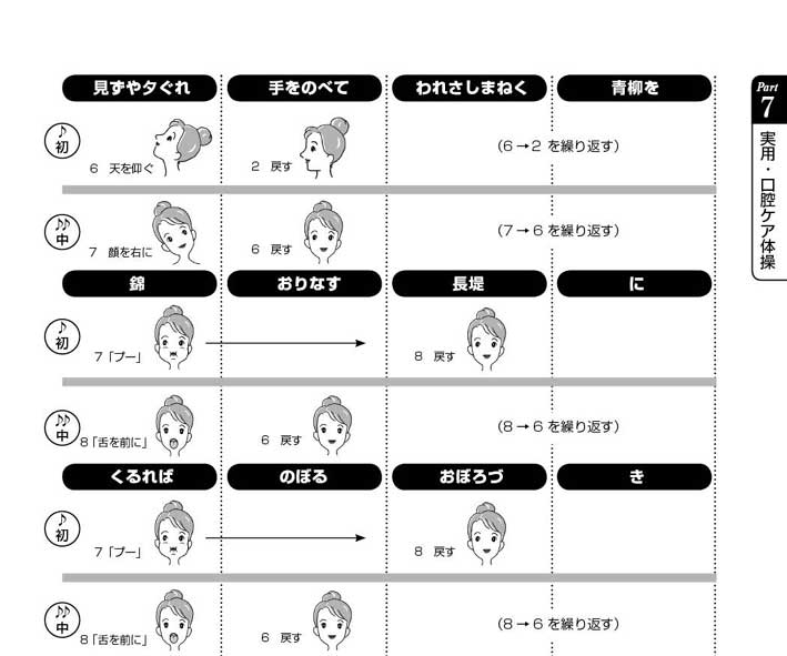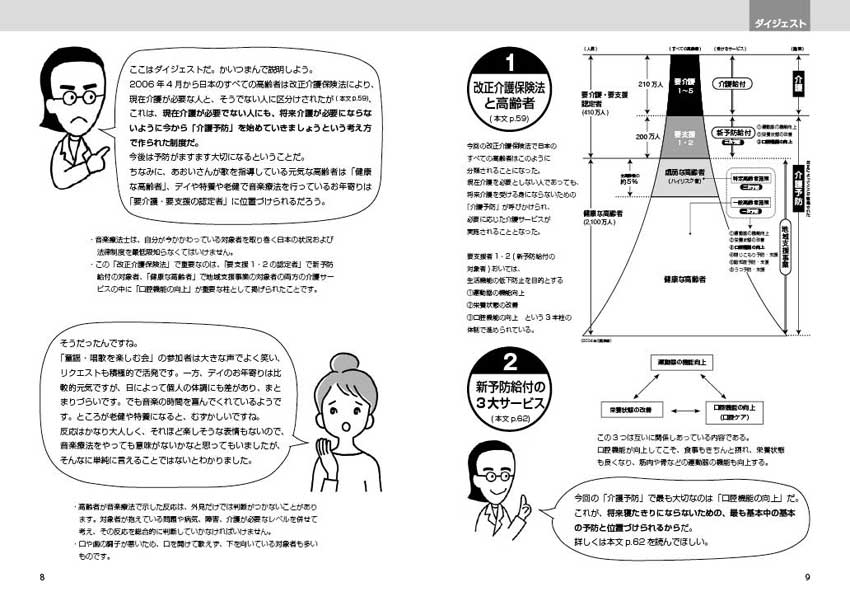 なぜ音楽療法と口腔ケアが関係あるの?/歌うことの医学的効果は説明できるの?/改正介護保険法を知らずに高齢者医療は語れない/国民生活に浸透する「介護予防」の柱の一つが「口腔ケア」/口腔ケア=歯みがきだけではありません/口は、命の入り口&病気の侵入口/歌うことが寝たきりや誤嚥性肺炎を予防する/そのメカニズム/歌を使った摂食嚥下リハビリテーション実践法/食事の前に行う口腔ケア「寅さん体操」ほか