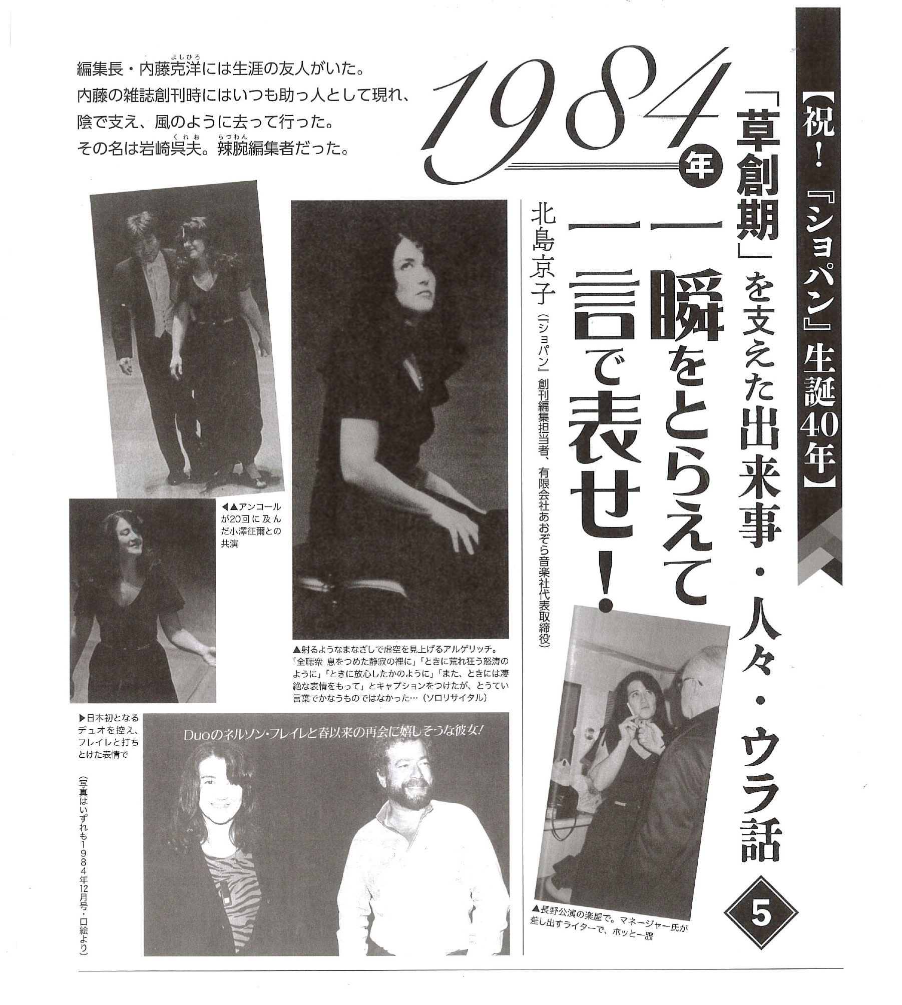 「よし! 秋の来日まで、連続して毎号アルゲリッチを取り上げるぞ!」と即決。1984年4月号に「アルゲリッチ来日・第1報」、5月号に「第2報」、6月号に「第3報」と特別ワクを組み、毎号アルゲリッチの演奏論と人間論をさまざまな執筆陣に寄稿してもらった。