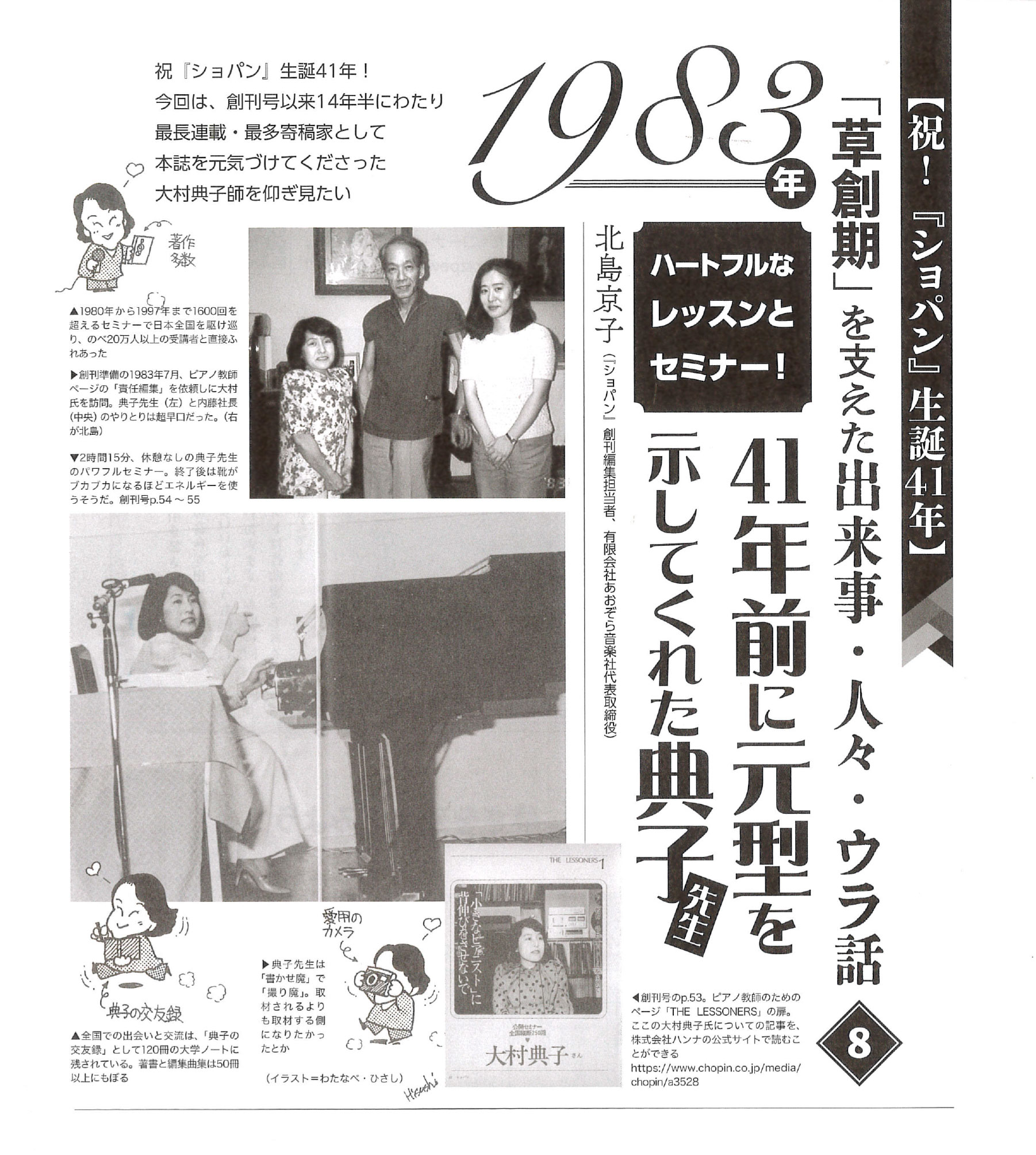 出会いは『ショパン』創刊前の1980年初頭。大村典子講師によるピアノ教師セミナーが各地の楽器店で大評判となっていた。さっそく内藤社長は近郊の楽器店に足を運び、セミナー会場の最後列に席を取った。大村講師が登壇するや、その一言一句、一挙一動に耳目を釘づけさせ、「すごいインパクトだ!」とうなったのだった。一度出会ったら忘れられない。アレグロな語りとともに、小柄な全身から放つ強烈なオーラが、受講者の心に光を注ぎ込む。